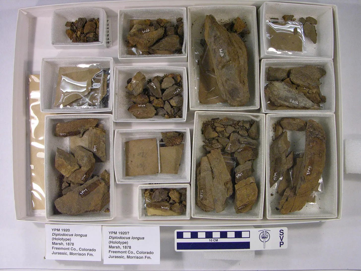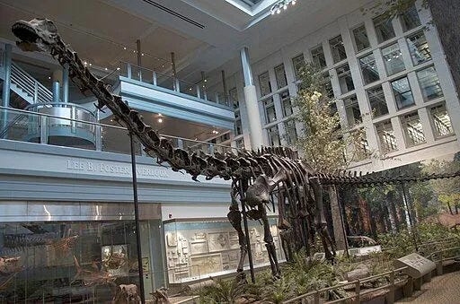 It’s worth being specific about what it is that was actually found. Fossils, after all, are “two dimensional imprints of an organism that doesn’t contain any organic material.”(56) Then there are the bones. For example, here is Diplodocus, on display.