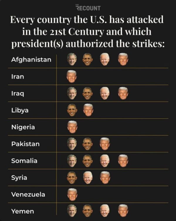 The presumption that America has the right to tell other nations how to conduct themselves is wrong and has not resulted in “peace and prosperity but an unending series of wars and crises.”(78) And it was only the other day that we were being showered with that President of Peace dreck, yet Trump’s record of aggression is worse that any of his recent predecessors, with power to add.